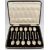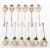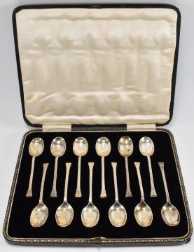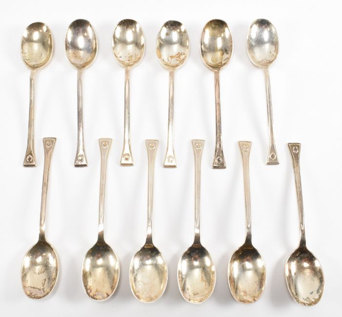 A 1920s Art Deco era cased set of twelve silver hallmarked tea spoons with horse shoe finials complete in the presentation case. Hallmarked for Sheffield, date letter K for 1927 by Joseph Rogers. RD No 705822. Weight approx 107g.