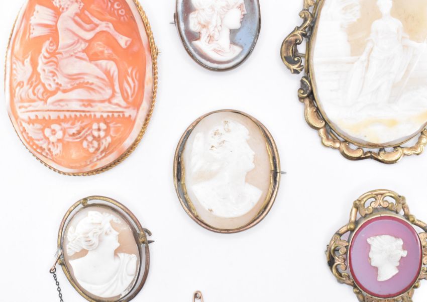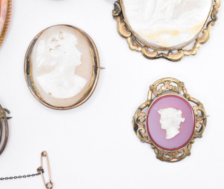 A group of six mixed 20th Century cameo brooches to include a gold plated cameo brooch carved with Britannia, a carved shell brooch depicting a classical figure with a horn, two cameo brooches depicting female figure facing right, a gold plated cameo brooch with a red glass cameo and another. Largest measures 6.5cm, smallest measures 3.5cm.