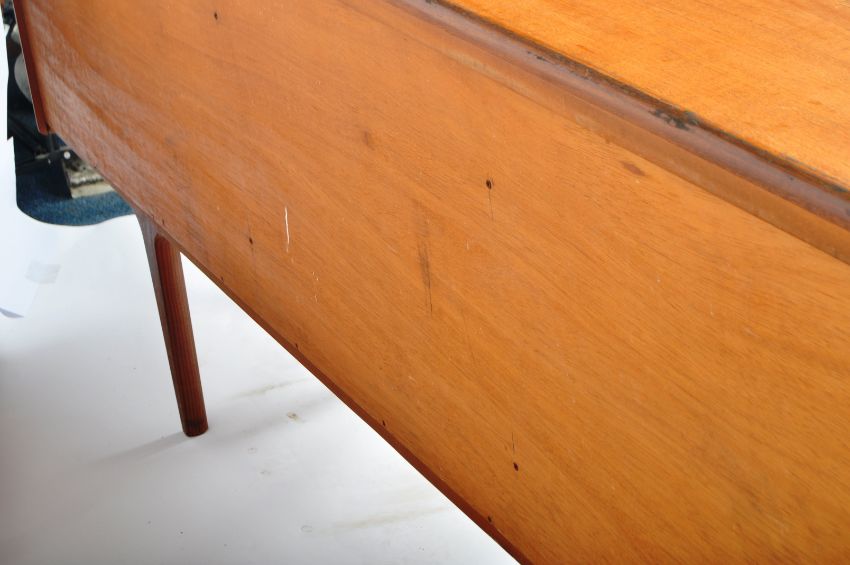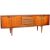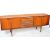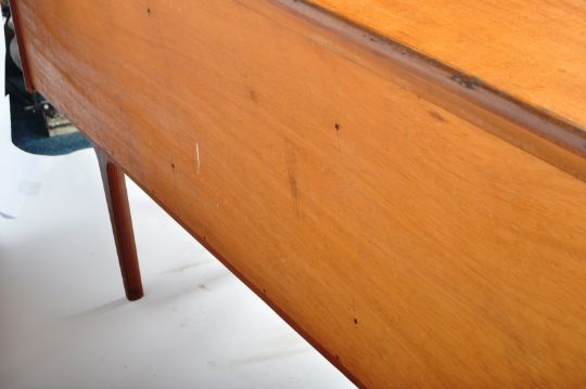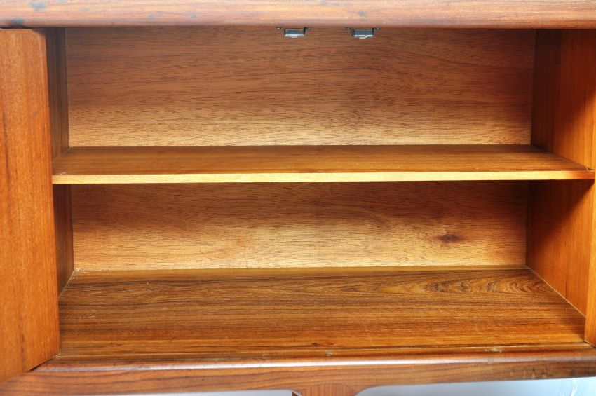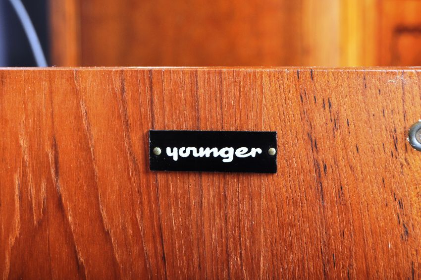 John Herbert - A. Younger Ltd - A 1960's retro vintage British Scandinavian inspired teak wood sideboard credenza having a central bank of four drawers flanked by a twin door cupboard having shelved interior to either side, handles for both doors and drawers being lipped. Raised on flat tapering legs. Makers plaque to drawer. Measures; 80cm x 213cm x 46cm.