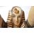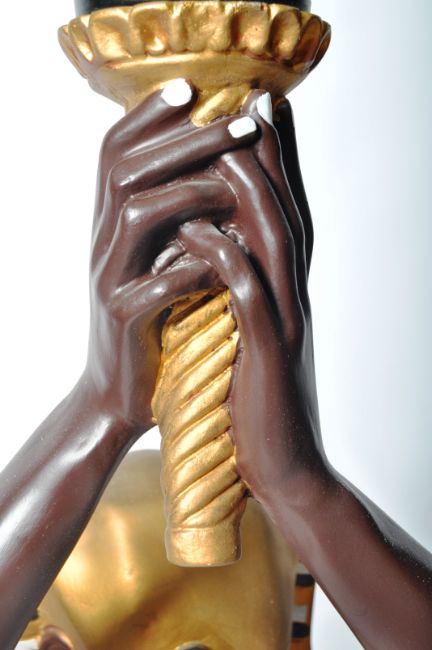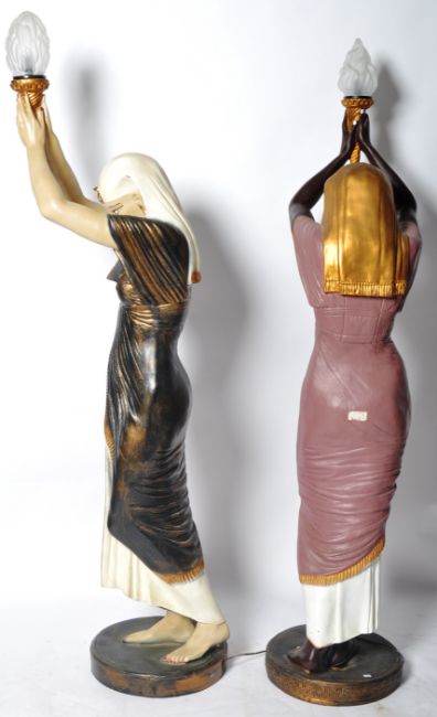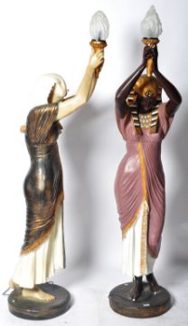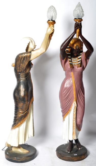 A pair of floor standing standard lamps in the form of Egyptian women. Both having Pharoah type headdresses and modelled with arms raised holding pressed glass flame shades. Measures approx; 188cm x 42cm x 45cm.