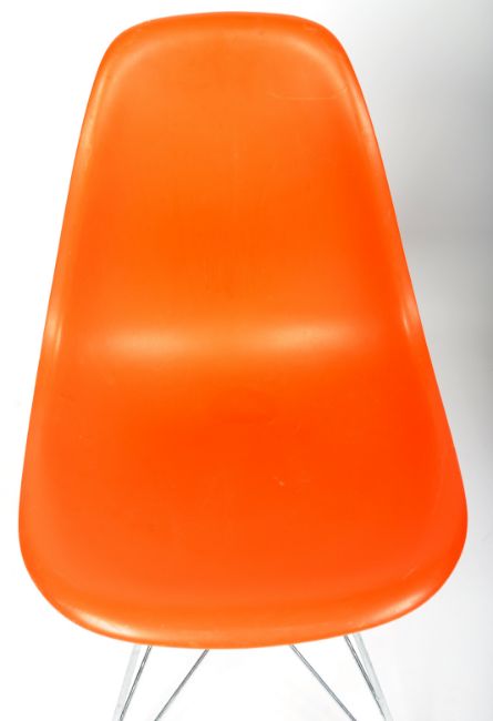 Charles & Ray Eames - Vitra - DSR Eames Plastic Chair - A matching set of six early 21st Century 2004 projection moulded dining chairs with each finished in vibrant orange. Each chair raised on chromed Eiffel bases. Impressed maker's marks to the bases with label present for Geprüfte Sicherheit. Wear commensurate with age. Each chair measures approx; 82cm x 46cm x 47cm.