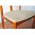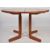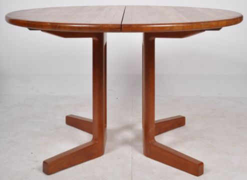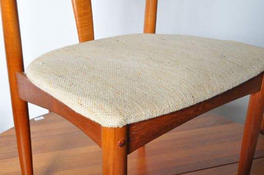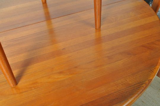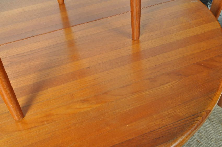 Johannes Andersen - Uldum Mobelfabrik -Julianne Chairs & dining table - A vintage dining suite comprising a set of six 20th century Danish retro vintage teak wood dining chairs having a curved and angled panel backrest with a padded seat, all raised on round tapering legs. The table having an oval extending top with two extra leaves with all raised and supported on angled supports. Table measures approx when closed;