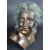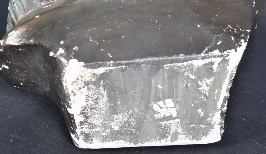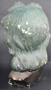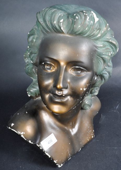 A vintage 20th Century Art Deco advertising point of sale shop display haberdashery millinery chalkware female mannequin head bust facing right with brushed back curls. Painted with a bronze effect with hair painted in dark green. Wear commensurate with age. Measures approx; 37cm x 26cm x 15cm.