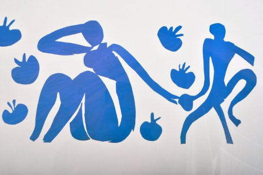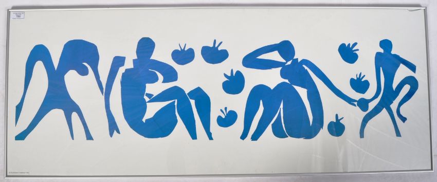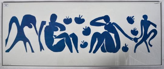 After Henri Matisse 1869-1954 - Succession - A retro vintage late 20th Century coloured print. The picture depicting stylised figures in blue over a white ground. Framed and glazed. Printed Succession H. Matisse 1997 to corner. Measures approx; 48cm x 121cm.