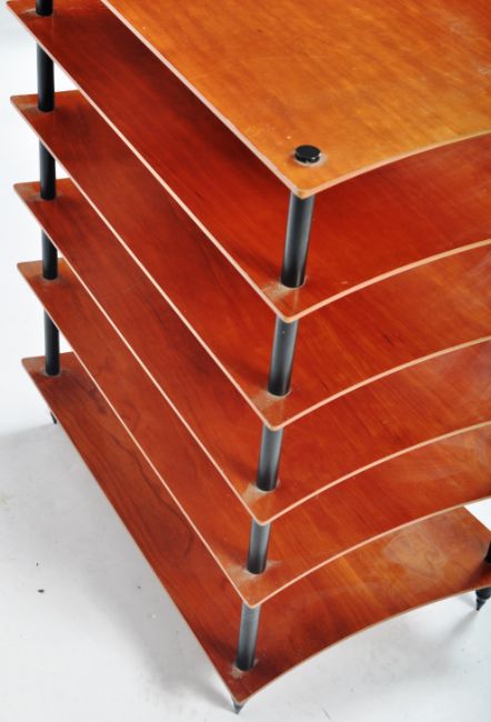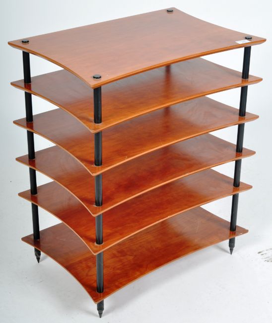 Quadraspire - Q4 Evo - A contemporary music multi tier Hi-Fi stand having six tiers with each shelf having curved sides. All the Q4 EVO shelves are specially engineered to reduce mass and resonance to deliver a clearer, cleaner musical performance. All supported by aluminium columns raised on spike feet. Measures approx; 71cm x 59cm x 40cm.