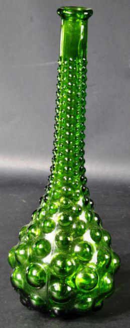 Empoli Glass - Genie bottles - Two retro 20th Century green coloured genie bottles one emerald in colour with diamond cut patterns together with mid size bright green hobnail patterns. Each with stoppers. Tallest measures approx; 56cm.
