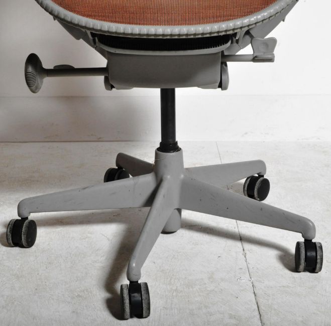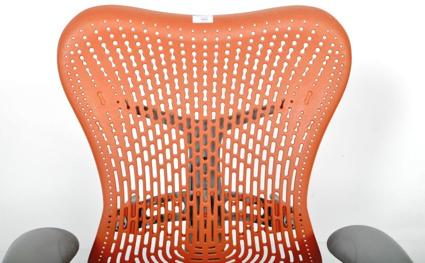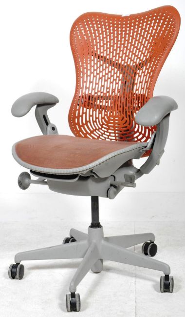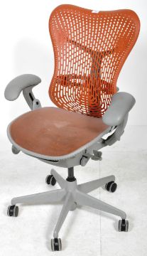 Studio 7.5 - Herman Miller - Mirra 2 - A late 20th Century retro swivel desk chair with adjustable positioning for posture. The armchair raised on a five point star base and castors. Mould marks for Herman Miller to the back with all finished in red and grey. Measures approx; 102cm x 73cm.