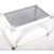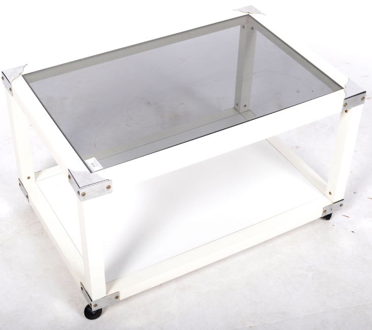 A retro vintage late 20th Century glass coffee table in the manner of Merrow Associates. The occasional table having an inset glass top with white coated sides, polished metal corners and raised on black castors. Measures approx; 41cm x 69cm x 46cm.