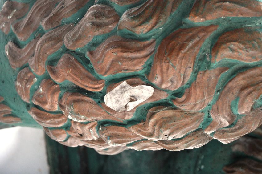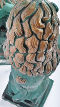 A matching pair of early 20th Century reconstituted stone garden figures in the form of seated lions holding shields. Each finished in green paint with gilt destiling to their manes and shields. Raised on stepped square bases. Each lion measures approx; 85cm x 26cm x 26cm.
