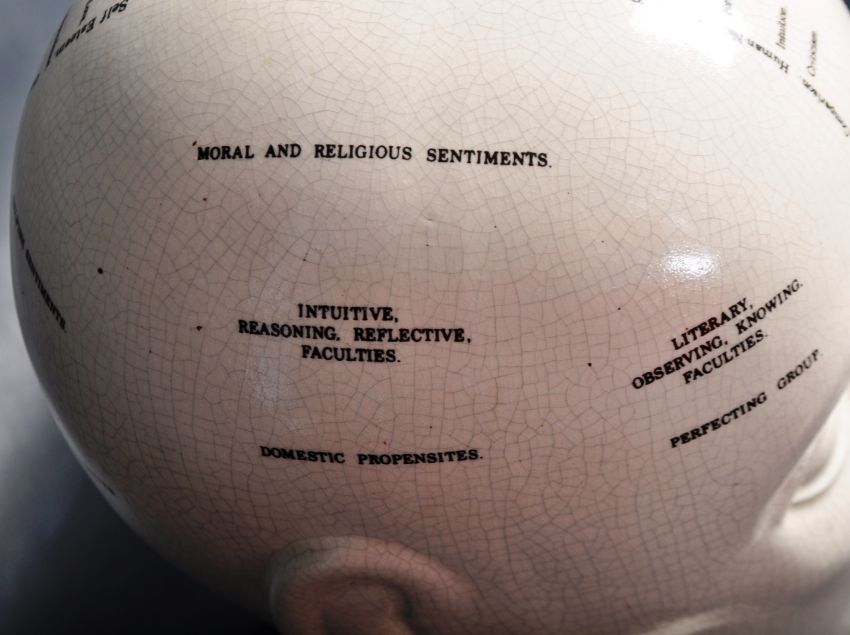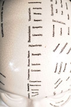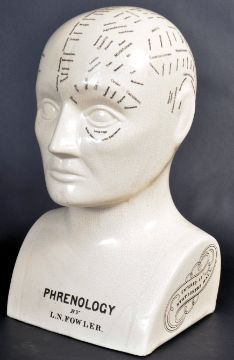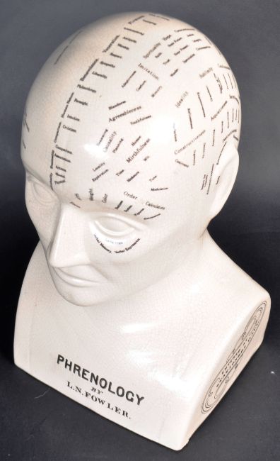 A large vintage 20th century Victorian manner ceramic Phrenology Head crackle glaze cream ceramic bust, marked ' Phrenology By L N Fowler. Notation throughout with script to verso. Great example with no visible signs of damage. Measures 32cm-high.