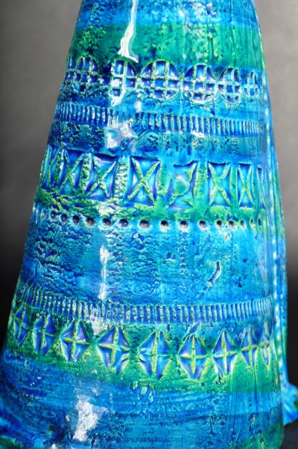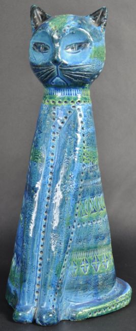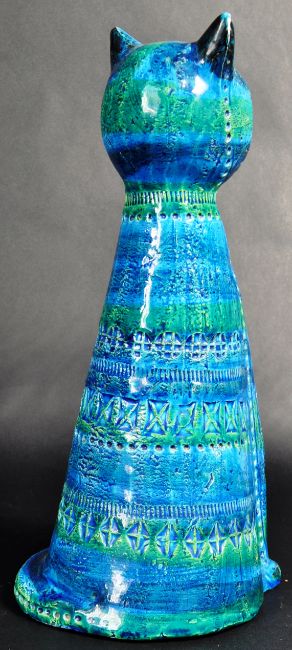 Aldo Londi - Bitossi - Rimini Blu - A retro 20th Century Italian glazed studio art pottery sculpture of a stylized cat decorated with incised geometric bands and motifs. Singed to the inner 4223 Italy. Wear commensurate with age mostly to the ears, overall a good example. Measures approx; 33cm x 13cm x 17cm.