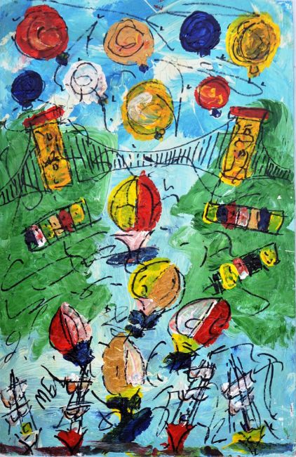 Local Interest - A 20th Century retro vintage abstract oil gouache on board painting depicting an iconic scene of balloons over Isambard Kingdom Brunel's Suspension bridge in Clifton. The artwork signed to lower section. Measures approx; 92cm x 61cm.