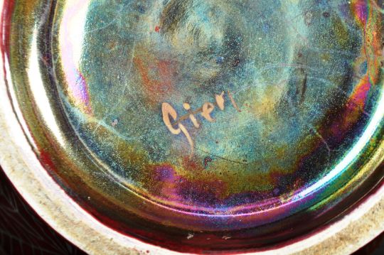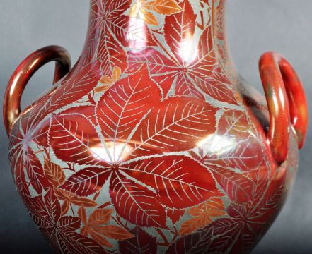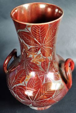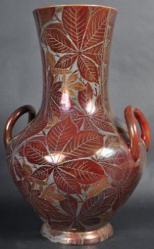 Gien - A large early 20th Century French ceramic luster glazed twin handled vase having a flared top tapering to a bulbous body having shaped handles to each side. All decorated with leaves and motif bands with all raised on a circular foot. Signed to base Gien. All round good condition. Measures approx; 39cm x 25cm diameter.