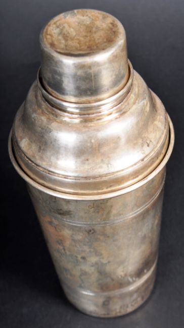 A retro vintage 1930's Art Deco silver plated cocktail shaker. The cocktail shaker having a removable lid with banded decoration and stamped England Silver Plate to base. Measures approx; 21cm tall.