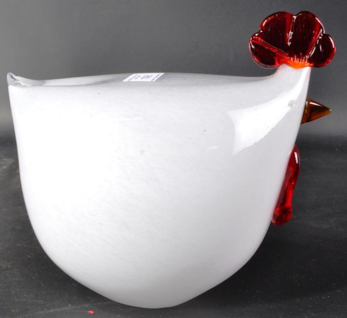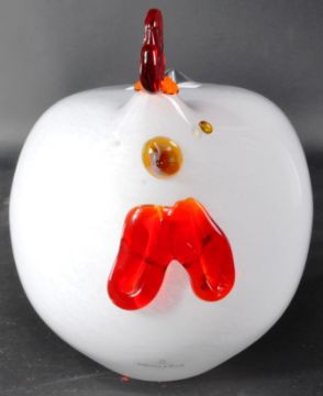 Villeroy and Boch - A retro 20th Century designer glass ornament / figure in the form of a chicken with with white and red coloured glass. Makers sticker present. Measures approx; 21cm x 22cm.