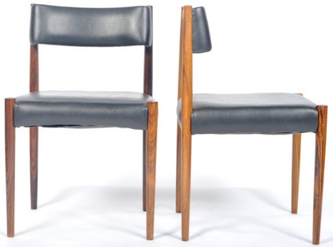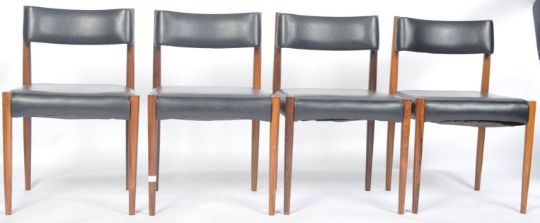 Robert Heritage - Archie Shine - Knightsbridge Chairs - A matching set of eight retro vintage 20th Century 1960's dining chairs. Each chair having black leather scroll shaped back top rails with padded leather seats with each raised on turned tapering supports. Condition; no visible damage, wear to the leather, all structurally sound. Each chair measuring approx; 77cm x 45cm x 47cm.