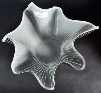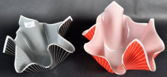 A pair of retro vintage 20th Century Chance Glass studio art glass handkerchief form bowls. The bowls in red & black with white stripes. Some minor chips present. Measures approx; 24cm wide.