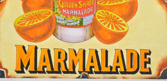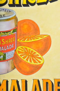 Golden Shred Marmalade - A contemporary oil on board artist's impression painting of a traditional advertising enamel sign. The sign depicts a jar of marmalade surrounded by oranges on a cream base. Large block font in yellow & orange read "Golden Shred Marmalade" with imitation rusting to edges of sign. Minor wear, overall good. Measures approx; 60cm x 60cm.
