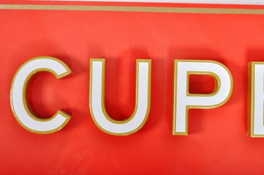 Hamleys - A large vintage 20th Century hand painted toy shop sign for Hamleys having a rich red ground colour with gilt borders and applied central lettering in gold and white. Lettering reads 'Cupboard' Decorative small H to each corner for Hamleys. Glitter finish throughout. Measures approx; 35cm x 245cm.