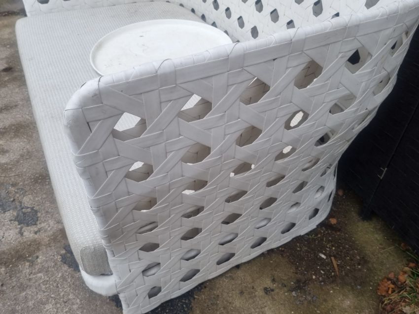 B&B Italia - Canasta - A contemporary high-end designer outdoor / garden sofa settee and matching table of circular form with metal white tray that sits atop. The sofa and table of polyethylene fiber strips finished in white. Sofa measures approx; 89cm x 190cm x 97cm.