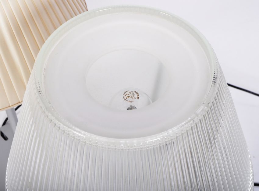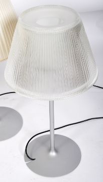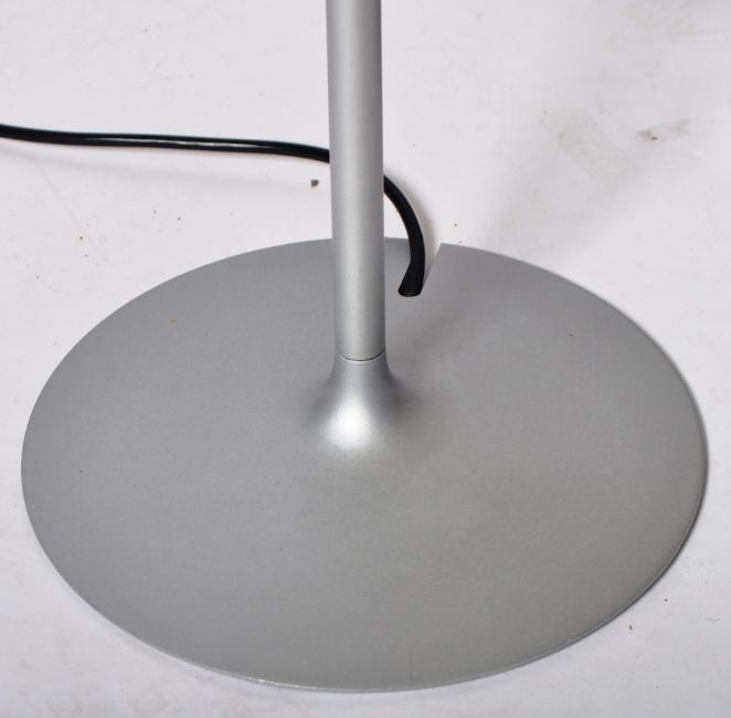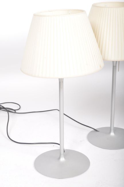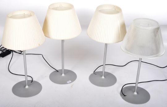 Philippe Starck for Flos Romeo Babe - A set of 4 table / side lamps having grey metal upright frames with terraced bases to each. The lamps consisting of one glass shade to a lamp, the other three with fabric shades to each. Measures 66cms  x 26cms