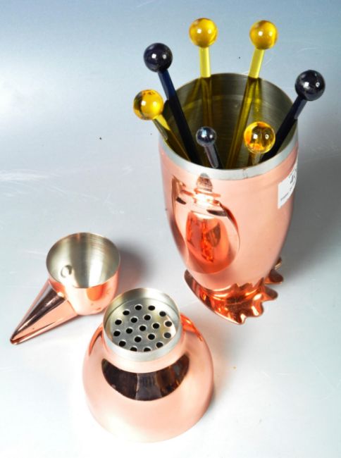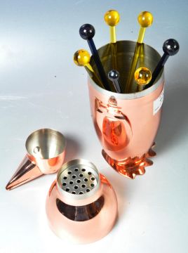 A contemporary copper effect stainless steel cocktail shaker pourer in the form of a penguin wearing a bow tie. Measures approx; 24cm tall.