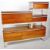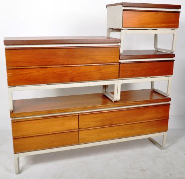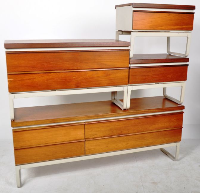 A retro vintage 20th Century teak wood bedroom suite comprising a pair of single drawer bedside cabinets raised on shaped quadrille type legs, matching long dressing table chest / sideboard with circular mirror to top and a matching chest of drawers.