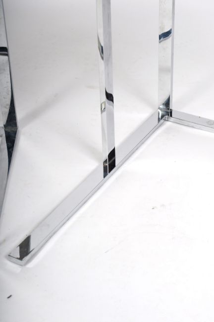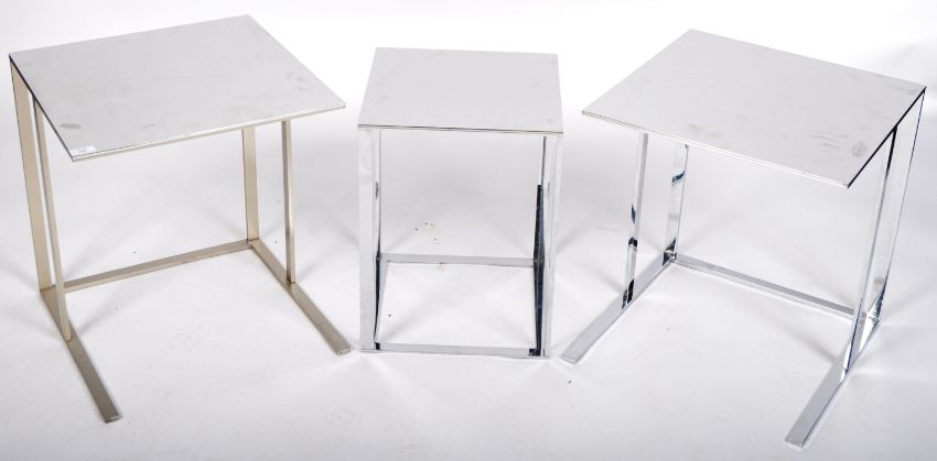 Antonio Citterio for B&B Italia - A set of three retro 20th Century Italian designer chrome cantilever side / lamp table havin square tops with angled supports. The smaller of three can slot under the other forming a two part nest. Labels present for B&B Italia. Biggest measures approx; 51cm x 46cm x 46cm.