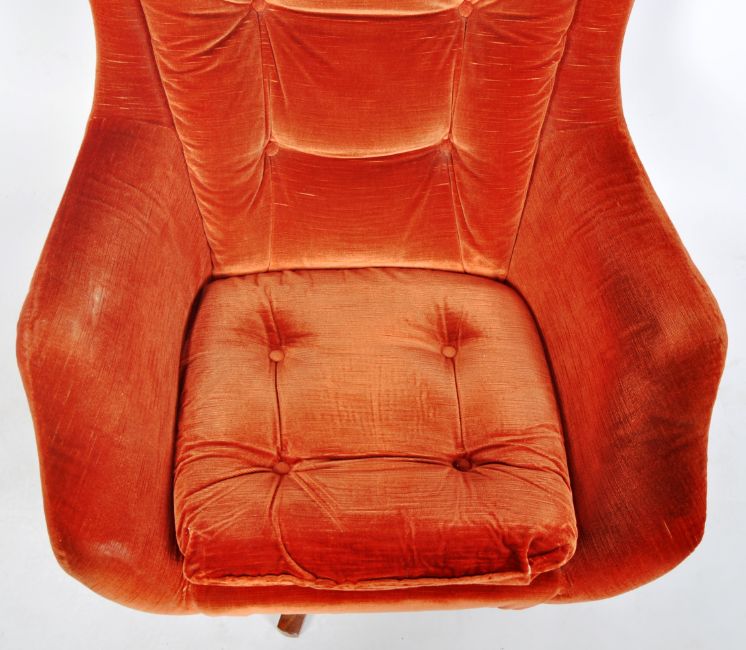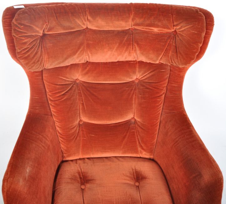 Parker Knoll - Statesman - An original retro vintage 1960's swivel egg chair having red velour upholstery with buttoned batwing top, shaped egg chair frame all raised on wooden splayed swivel base. Complete with cushion. Measures approx; 92cm x 86cm 72cm.
