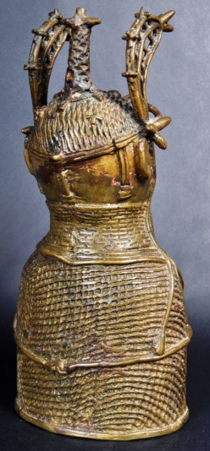 A heavy 20th Century African Benin cast hollow bronze figure of a native woman wearing a headdress and garments. Unmarked. Measures approx; 32cm x 14cm.