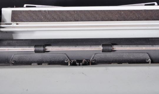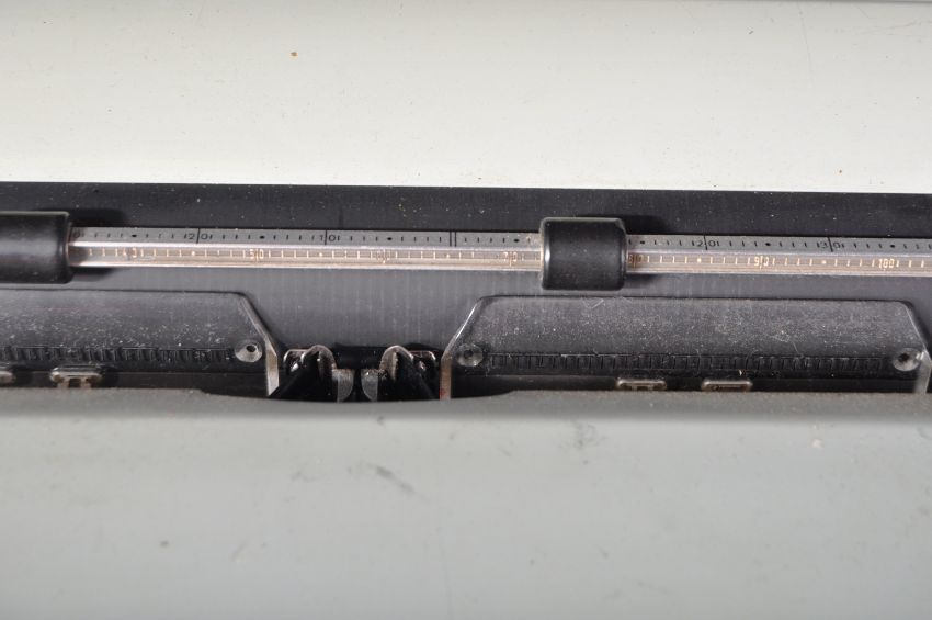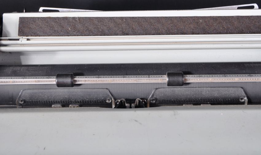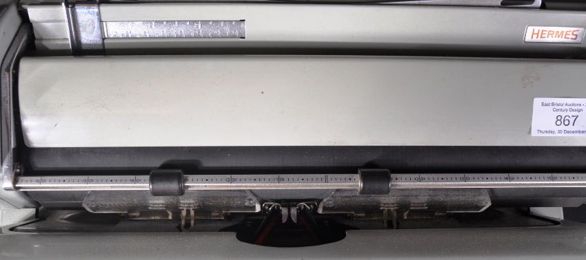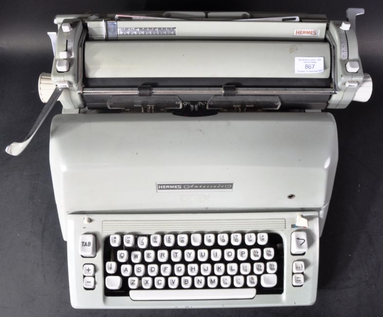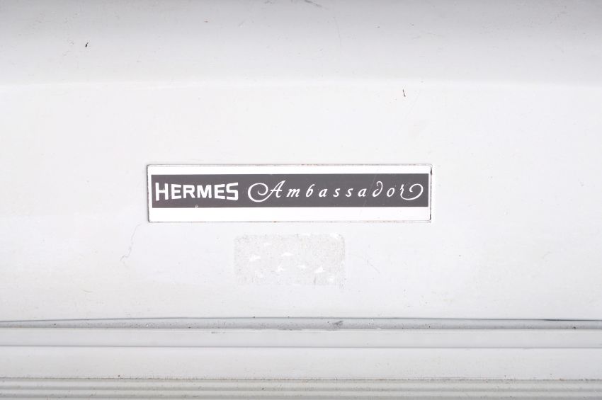 A retro vintage mid 20th Century Hermes Ambassador Swiss typewriter. The typewriter having a grey plastic body with series of typing keys and appears in good order. Measures approx; 26cm x 40cm x 43cm.