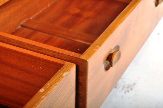 Lucian Ercolani - Ercol - Windsor - Model 468 - A retro vintage 1960's solid elm wood sideboard credenza having a twin door shelved cupboard alongside a single door cupboard with drawer, all above two wide drawers below. All being raised on ball castors. Overall good condition, damage to some handles. Measures approx; 76cm x 130cm x 50cm.