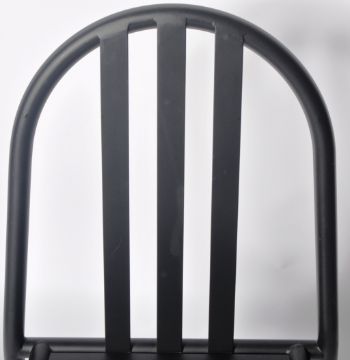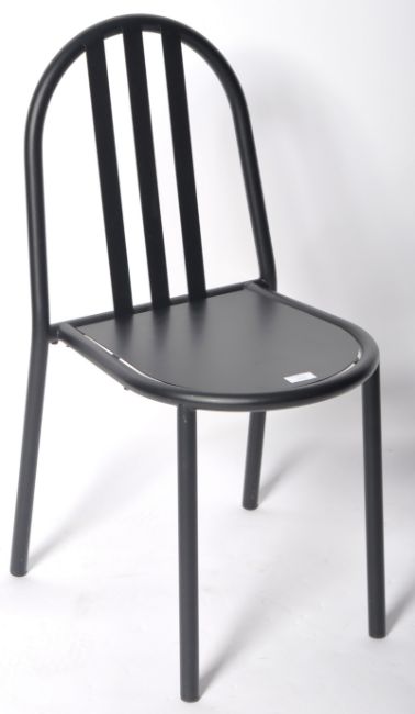 After Robert Mallet Stevens - A 20th Century French black steel stacking side chair / desk chair having a curved backrest with three metal slats, panel seat and raised on tubular metal legs. Measures approx; 81cm x 41cm x 46cm.