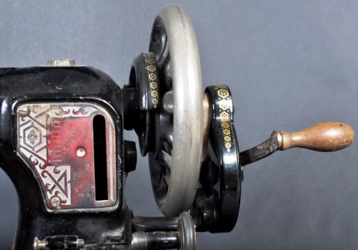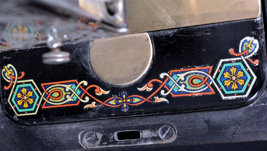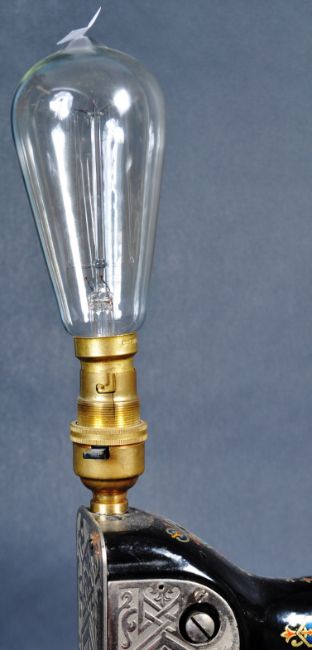 An upcycled vintage early 20th Century converted Hexagon table top sewing machine lamp with original stenciled decoration and makers marks / plaques. Sold as untested. Measures approx; 48cm x 45cm x 21cm.