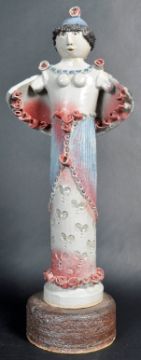 A retro vintage 20th Century studio art pottery abstract figure in the form of a woman having no arms wearing a cape adorned with rose heads. Cylindrical form to the lower half with further floral decoration. Raised on a circular wooden base. Impressed makers mark for jb. Measures approx; 43cm x 16cm.