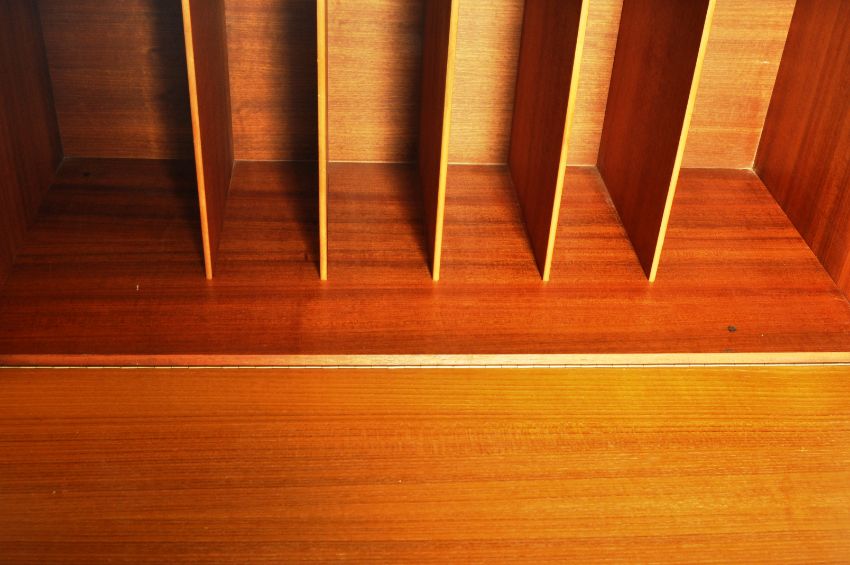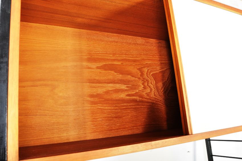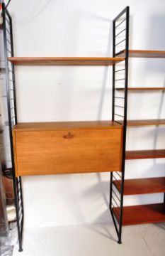 Robert Heal - Staples - Ladderax - An original retro vintage 20th Century 1960's teak wood four bay modular wall unit comprising of four black metal uprights with three long shelves, two bureau fall front units, six smaller shelves, twin door sliding cabinet, three bank chest of drawers and all connecting bars present. In overall good condition with some wear to some of the shelves and other minor wear commensurate with age. Key present. Original labels present. Measures approx; 201cm x 335cm x 41cm.