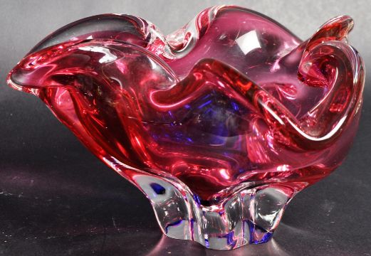 A collection of retro vintage 20th Century Czech studio art glass to include Josef Hospodka examples. Comprises a large fluted edge pink glass centrepiece bowl, pink and clear glass triform dish, pink and green glass quadform bowl and another. Largest measures approx 28cm wide.