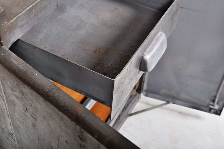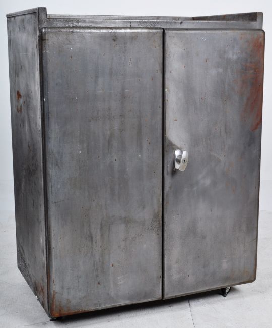 A retro vintage mid 20th Century versatool polished metal tool / kitchen cupboard chest of upright pedestal having a raised gallery top with twin doors below. The doors opening to reveal twin drawers having cup handles over three adjustable swing shelves below. All raised upon castors. Wear commensurate with, overall a good example. Measures approx; 94cm x 73cm x 50cm.