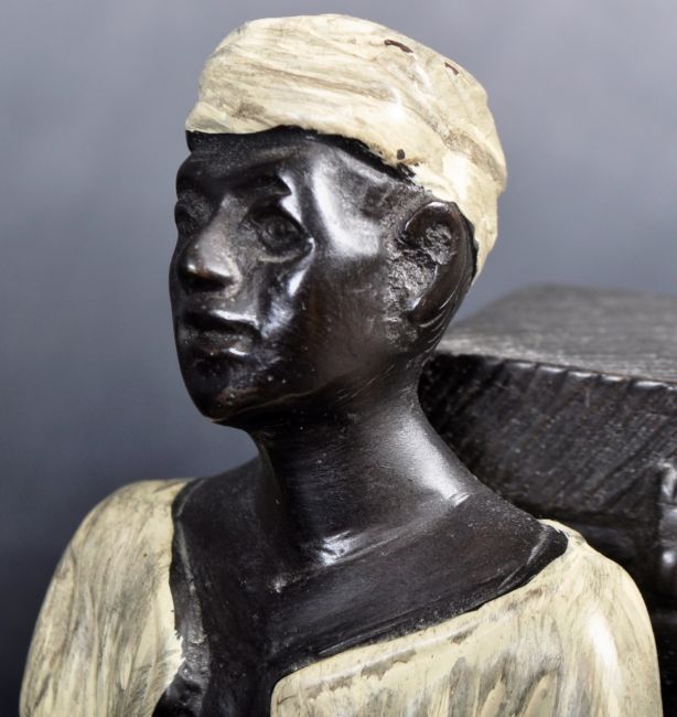 A late 20th Century Vienna style cold painted bronze figure of a begging boy hold a tray seated beside cases of his belongings. Measures approx; 10cm x 10cm x 16cm.