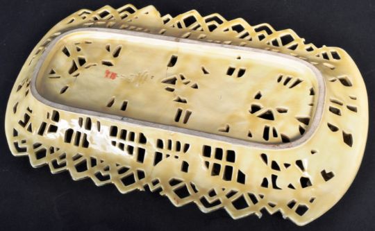 Zsolnay Pecs - A large decorative antique 19th Century Victorian Hungarian porcelain reticulated pierced basket / wall hanging plaque. Decorated with flowers over lattice ground with gilt detailing throughout. Impressed maker's marks and church stamp to the verso. Wear commensurate with age with damage to the lattice work. Measures approx; 38cm x 22cm.