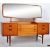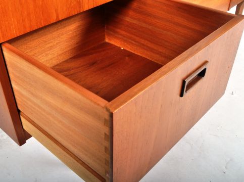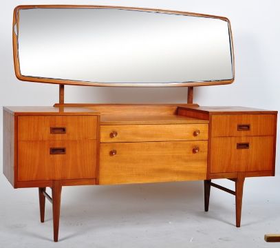 Nathan - A retro vintage mid 20th Century British design dressing table chest of teak construction having a bevelled teak framed round mirror of a chest base. Dropped centre section flanked by a dual bank of drawers to each side and central drawers below. All being raised on teak tapering supports. Measures approx; 112cm x 153cm x 45cm.