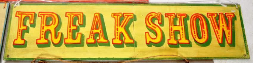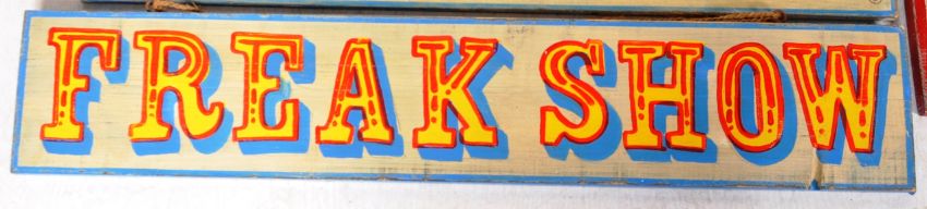 A collection of five retro vintage early - mid 20th Century circus fairground attraction sideshow signs. Wooden construction with hand painted notation and decoration.