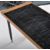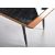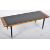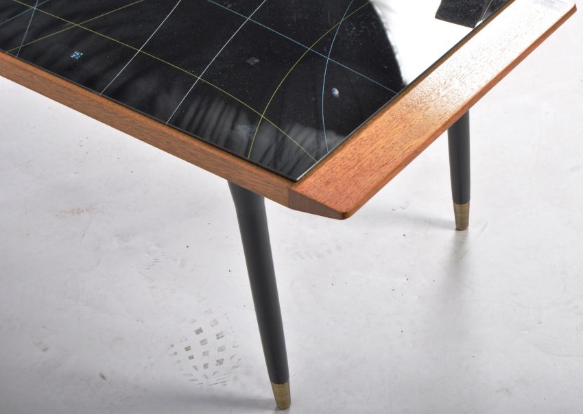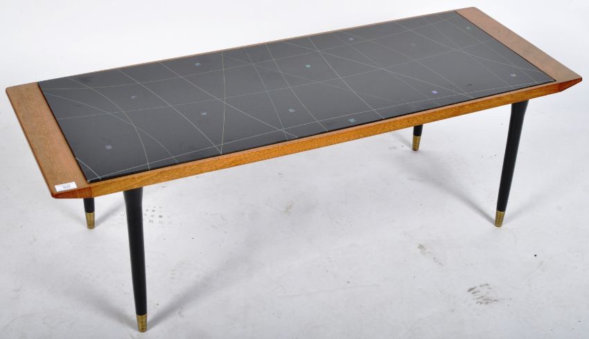 A retro vintage mid 20th Century coffee table of rectangular form having a teak framed top with drop in black glass center with lined decoration and abalone shell fragments. Raised on ebonised tapering supports. Measures approx; 43cm x 130cm x 46cm.