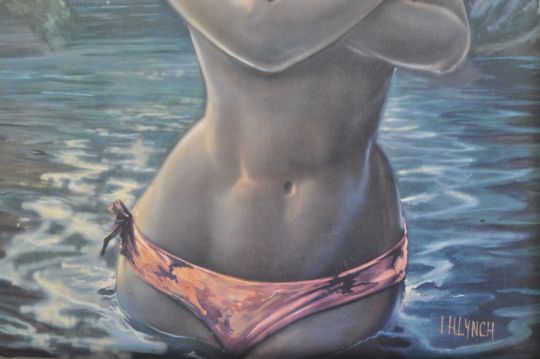 Joseph Henry Lynch (Born 1911-1989) - The Nymph - A retro vintage mid 20th Century portrait painting print on board depicting a semi nude lady stood in a forest river. Set within a period frame. Label to verso. Measures approx; 73cm x 53cm.