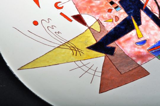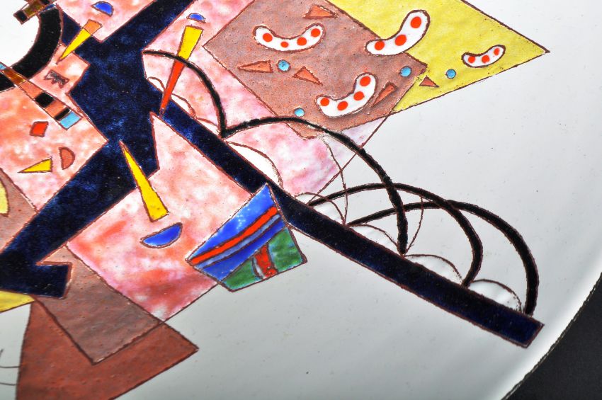 After Kandinsky - R. Casey - A retro 20th Century 1986 enameled plate / wall hanging in the manner of Kandinsky on a white background. Signed and dated by the artist to the verso. Wear commensurate with age, overall good. Measures approx; 36cm diameter.