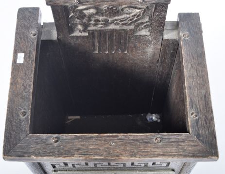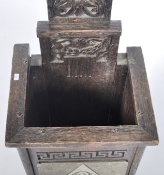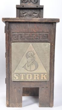 A retro vintage early - mid 20th Century carved oak stick stand by repute to be from the Stork Club in New York - America. Tall carved oak back with central rectangular stick stand box and cast metal Stork panel to front. Measures approx; 122cm x 38cm x 30cm.