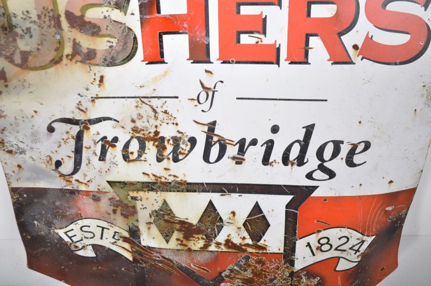 Ushers Of Trowbridge - A vintage mid 20th Century pub display / brewery enamel advertising enamel sign for Ushers. The sign of shield shape form having red and white ground with black lettering. Wear commensurate with age. Measures approx; 111cm x 111cm.