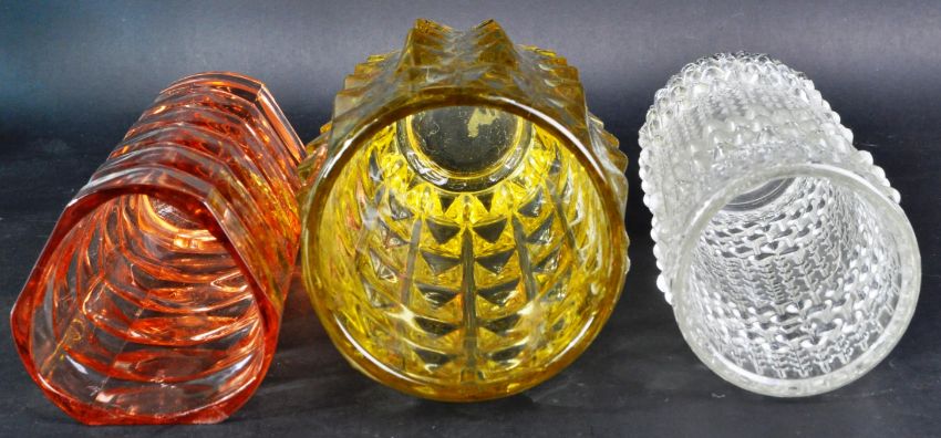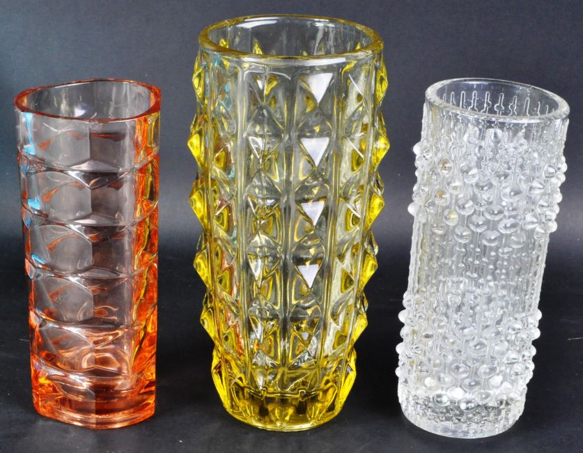 A mixed collection of five retro 20th Century designer glass vase to include a clear flint glass 'candle wax' vase by Frantisek Peceny for Hermanova in the 70's (pattern number 20245), large blue vase by Vaclav Hanus 1957 for Rudolfova part of Sklo Union (pattern number 12992), yellow glass pineapple vase by Jiri Zejmon for the Rosice glassworks (pattern number 1292), Luminarc French pink glass vase and a clear glass Frantisek Vizner for Sklo Union vase (pattern number 13181) . Tallest measures approx; 16cm x 10cm diameter.