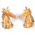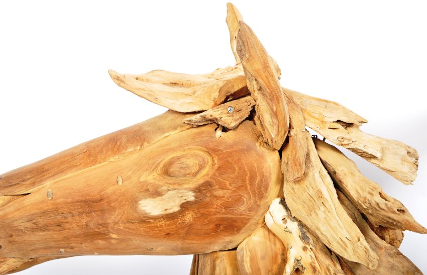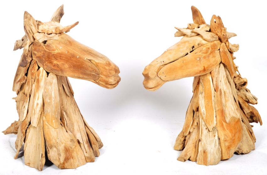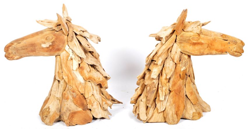 A large pair of retro vintage 20th Century sculptural models of horses head. Each horse head constructed from various pieces of driftwood with some lightly carved details. Measures approx;