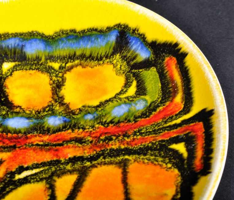 Carol Cutler and Cynthia Bennett - Poole Pottery - Two retro vintage 20th Century ceramic studio art pottery pieces to include a yellow ground vase with floral abstract decoration and textured sides, signed to base for Bennett. Together with a plate having abstract decoration and yellow ground, signed to base Cutler. Vase measures approx; 21cm x 10cm x 7cm.